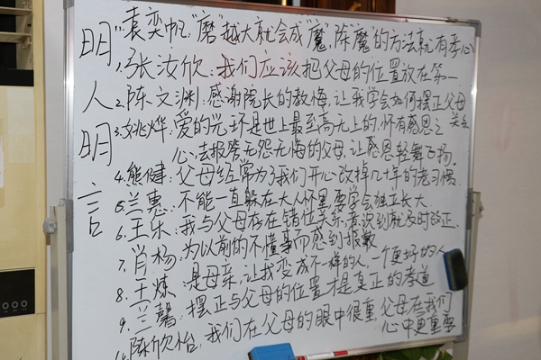 在结营仪式上,营员们一个个跪在家长面前读着写给父母的书信,向父母敬茶,与父母拥抱,和家长一起与院长合影。华桂中学的孩子只能对着手机屏幕下跪,向视频中的父母说着自己的心里话,无法拥抱父母,无法与家长合影。他们的父母都太忙,都在为全家生计苦苦打拼。话未说完,声已哽咽,看得其他家长都心疼不已。