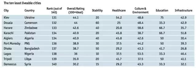 基辅是唯一上了倒数榜的欧洲城市,教育和医疗方面分数都不低,但由于乌克兰和俄罗斯之间紧张的局势,让稳定方面的分数降到了20。